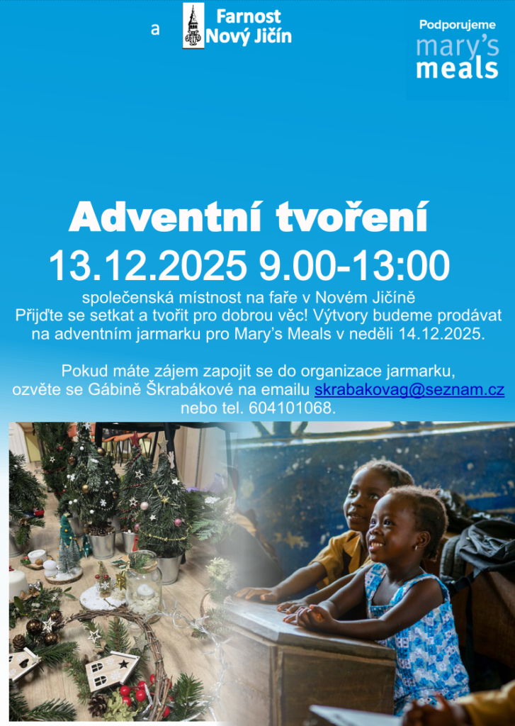 Zveme farníky a příznivce dobrovolnické činnosti na Adventní tvoření a Jarmark zaměřený pro chudé děti z třetího světa. Tato akce se uskuteční 13.12 – tvoření pro jarmark. 14.12 prodej na samotném jarmarku v budovách fary. Prodej se uskuteční po všech dopoledních bohoslužbách. Přijďte nejen podpořit chudé děti, ale také popřípadě popovídat si z blízkými u teplého nápoje. Pořadatelé vás prosí o hotovostní platby.
